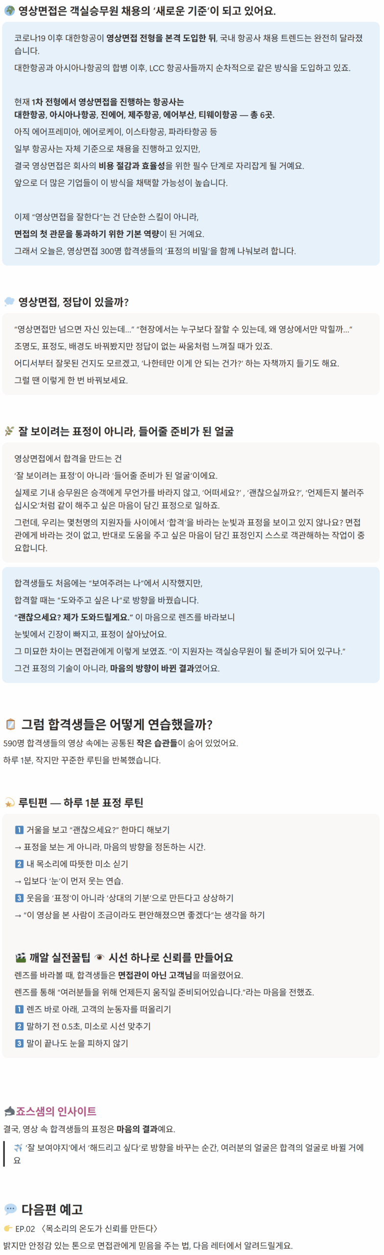 오늘의 포스트입니다. [영상면접 합격시리즈_①표정편]바라는 것 없는 얼굴이 합격을 만든다 댓글 달기 / publish-content / 글쓴이 josflight1 … 회원가입 후 콘텐츠를 구독해보세요.이 콘텐츠는 구독자만 볼 수 있습니다.로그인 후 구독해주세요. D-1[아시아나항공 영상면접 합격답변] 자기소개_안전역량강조ver공개 예정: 2025-12-02 00:00:00남은 시간 계산 중...D-2[아시아나항공 영상면접 합격답변] 신규취항지 추천공개 예정: 2025-12-03 00:00:00남은 시간 계산 중...D-3[기업분석]대한항공, 도심 숲 조성 ‘그린 스카이패스’ 2차 프로젝트 실시공개 예정: 2025-12-04 00:00:00남은 시간 계산 중...