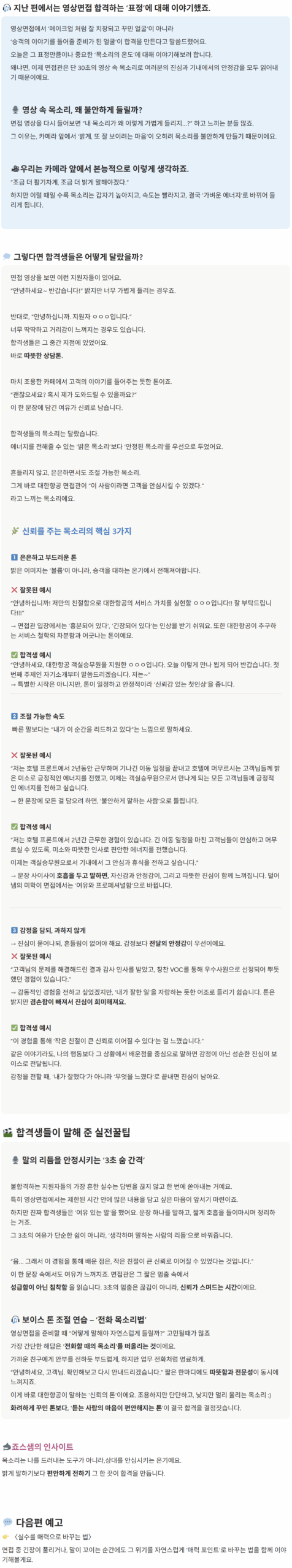 오늘의 포스트입니다. [영상면접 합격시리즈_②보이스편] 목소리의 온도가 신뢰를 만든다. (합격생 실전 꿀팁) 댓글 달기 / publish-content / 글쓴이 josflight1 … 회원가입 후 콘텐츠를 구독해보세요.이 콘텐츠는 구독자만 볼 수 있습니다.로그인 후 구독해주세요. D-1[아시아나항공 영상면접 합격답변] 자기소개_안전역량강조ver공개 예정: 2025-12-02 00:00:00남은 시간 계산 중...D-2[아시아나항공 영상면접 합격답변] 신규취항지 추천공개 예정: 2025-12-03 00:00:00남은 시간 계산 중...D-3[기업분석]대한항공, 도심 숲 조성 ‘그린 스카이패스’ 2차 프로젝트 실시공개 예정: 2025-12-04 00:00:00남은 시간 계산 중...