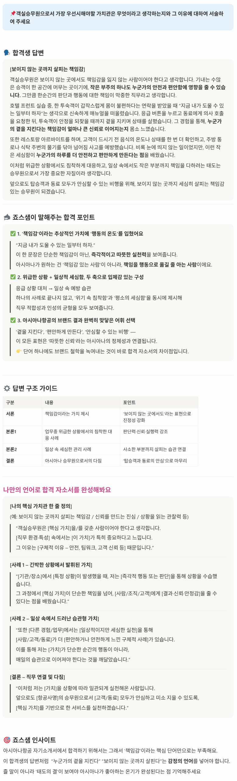 [아시아나 합격자소서] 객실승무원으로서 가장 우선시해야 할 가치관은 무엇이라고 생각하는지와 그 이유에 대하여 서술하여주세요