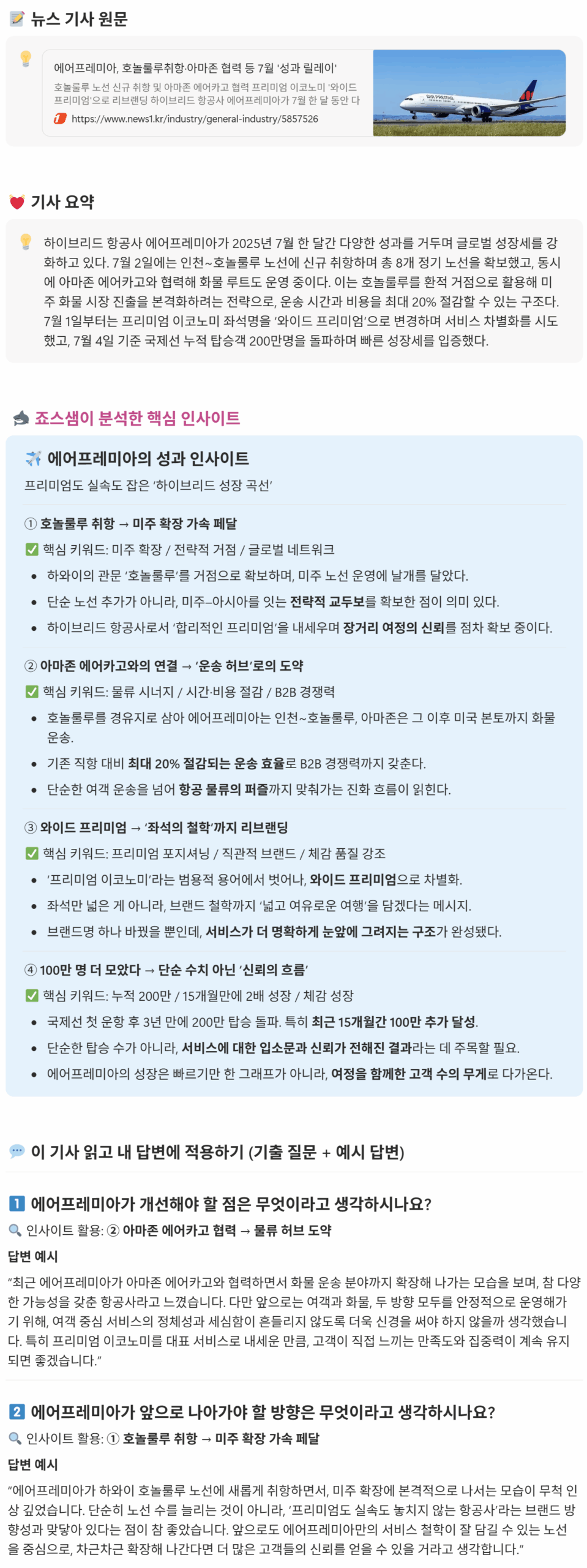 오늘의 포스트입니다. [에어프레미아 기업분석] 에어프레미아, 호놀룰루취항·아마존 협력 등 7월 ‘성과 릴레이’ 댓글 달기 / publish-content / 글쓴이 josflight1 … 회원가입 후 콘텐츠를 구독해보세요.이 콘텐츠는 구독자만 볼 수 있습니다.로그인 후 구독해주세요. D-1[아시아나항공 영상면접 합격답변] 자기소개_안전역량강조ver공개 예정: 2025-12-02 00:00:00남은 시간 계산 중...D-2[아시아나항공 영상면접 합격답변] 신규취항지 추천공개 예정: 2025-12-03 00:00:00남은 시간 계산 중...D-3[기업분석]대한항공, 도심 숲 조성 ‘그린 스카이패스’ 2차 프로젝트 실시공개 예정: 2025-12-04 00:00:00남은 시간 계산 중...